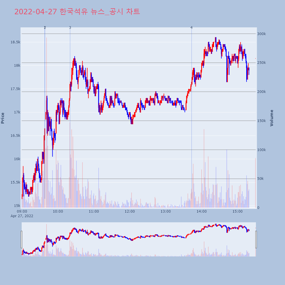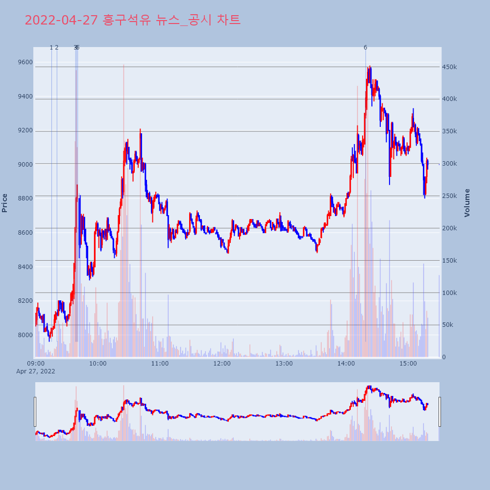 | 5 | 흥구석유, +13.41% VI 발동흥구석유(024060)가 VI가 발동했다. 전일 대비 | 조선경제 | 흥구석유 | 2022-04-27 09:40:33 |