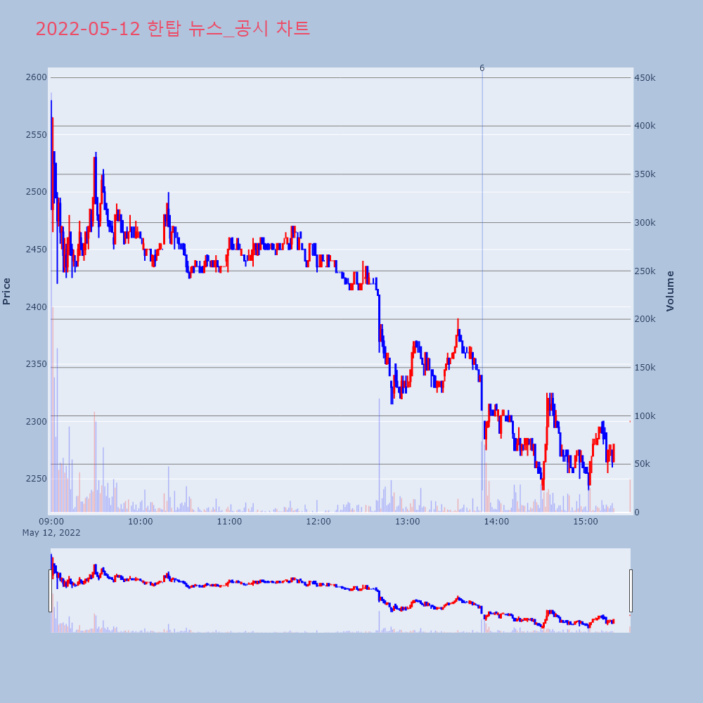 | 6 | 한탑, -7.40% VI 발동한탑(002680)이 VI가 발동했다. 전일 대비 7. | 조선경제 | 한탑 | 2022-05-12 13:50:29 |