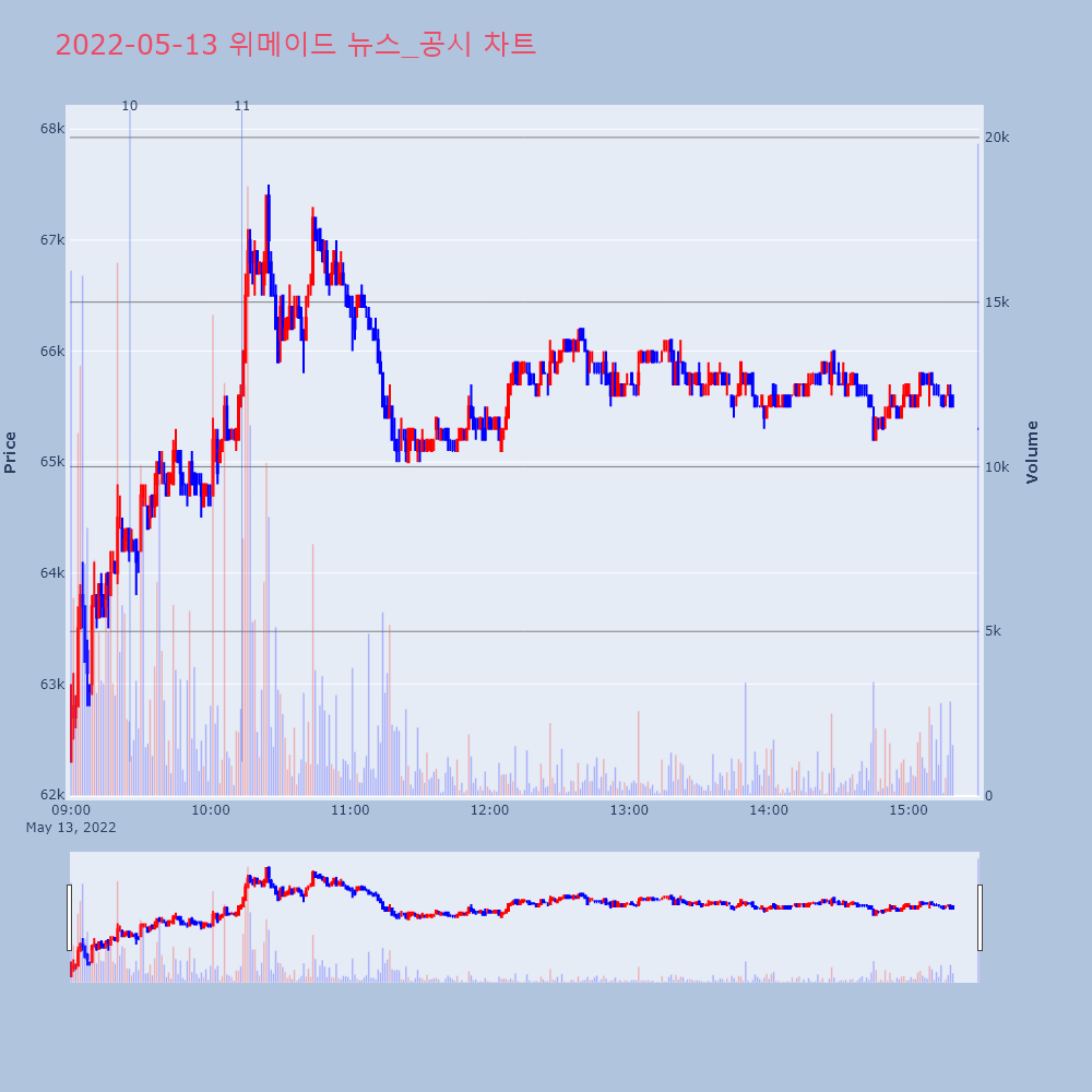| 4 | [특징주] 위메이드, 지배주주순익 33억원 적자… 5%↓ 제목 : [특징주] 위메이드, 지배주주순익 33억원 적 | 인포스탁 | 위메이드 | 2022-05-12 10:10:37 |