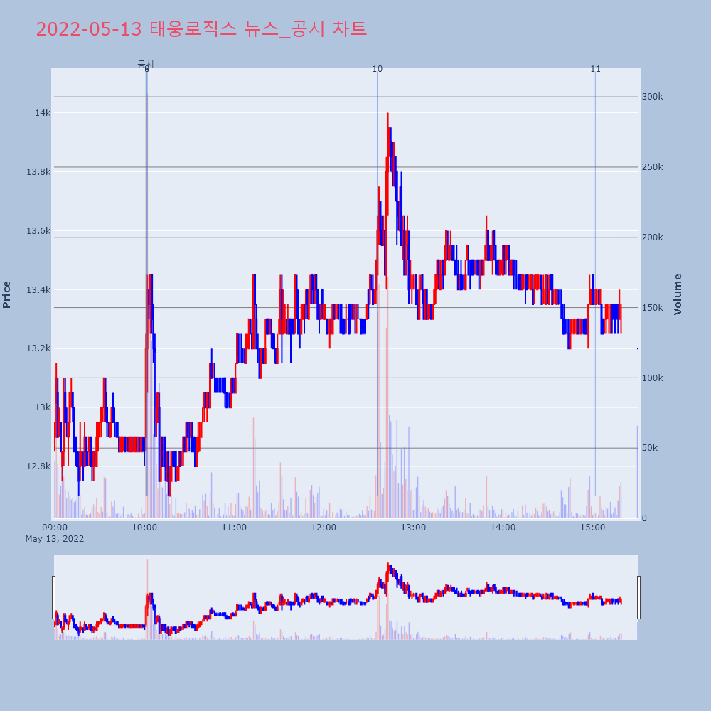 | 3 | 태웅로직스, +10.80% VI 발동태웅로직스(124560)가 VI가 발동했다. 전일 대비 | 조선경제 | 태웅로직스 | 2022-05-12 09:05:09 |