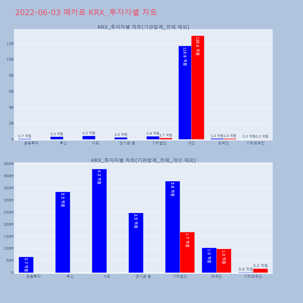| 투자기관 | 거래량_매도 | 거래량_매수 | 거래량_순매수 | 거래대금_매도 | 거래대금_매수 | 거래대금_순매수 |