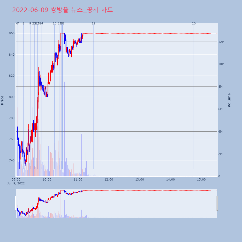| 11 | [특징주]쌍방울, 쌍용차 인수의향서 제출 소식에 급등▶ 하이스탁론, 선취수수료 없는 월 0.2%대 최저금리 | 이데일리 | 쌍방울 | 2022-06-09 09:35:38 |