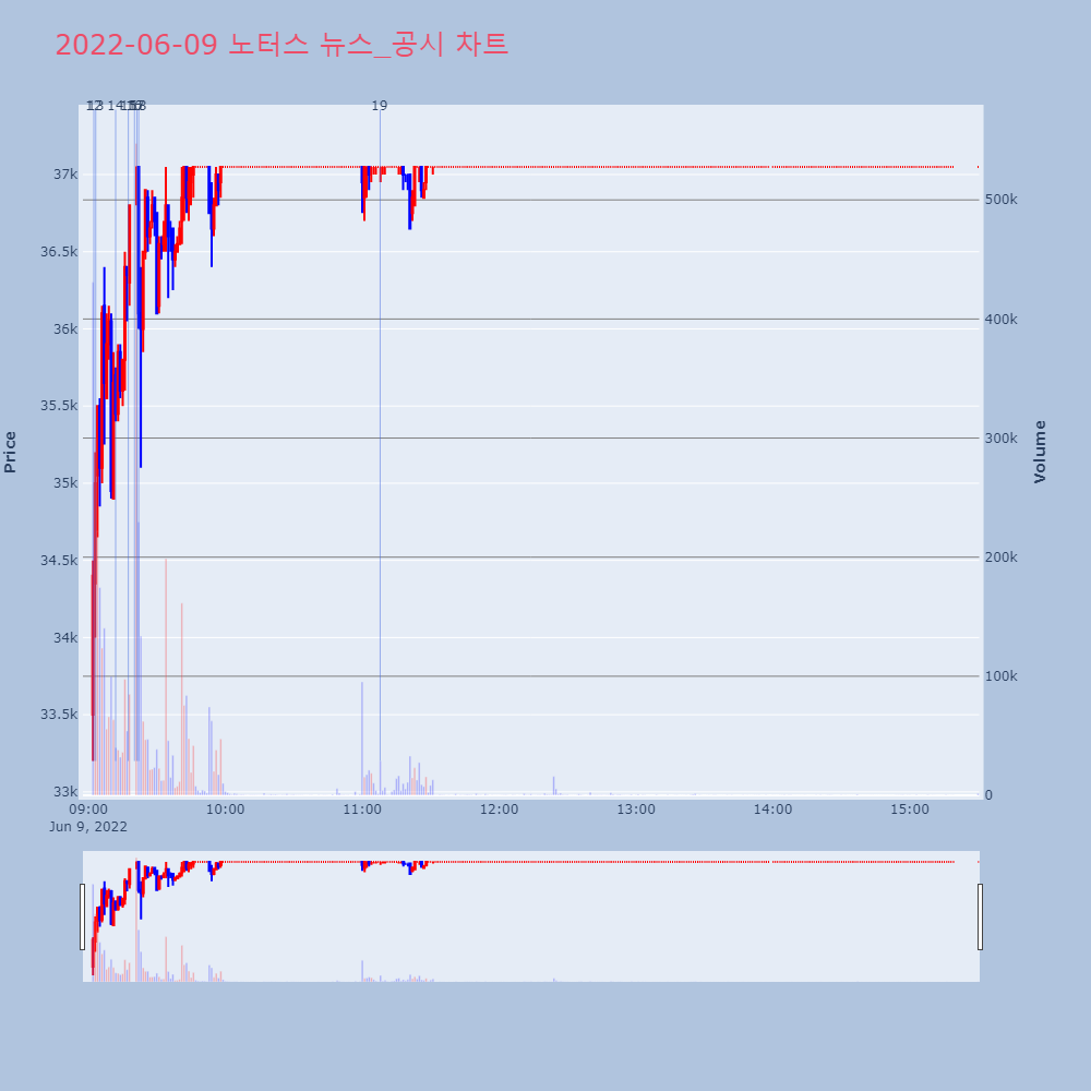| 16 | [특징주]노터스, 6거래일 연속 급등에 거래소 매매정지 예고 제목 : [특징주]노터스, 6거래일 연속 급등에 거래소 | 인포스탁 | 노터스 | 2022-06-09 09:20:12 |