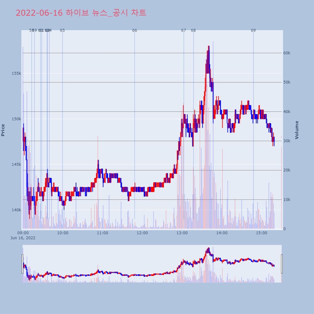 | 16 | BTS, 팀활동 중단 선언 쇼크…하이브 주가 20% 넘게 급락BTS가 데뷔 9년 만에 단체활동 중단을 선언했다.1 | 한경/증권 | 하이브 | 2022-06-15 09:14:59 |