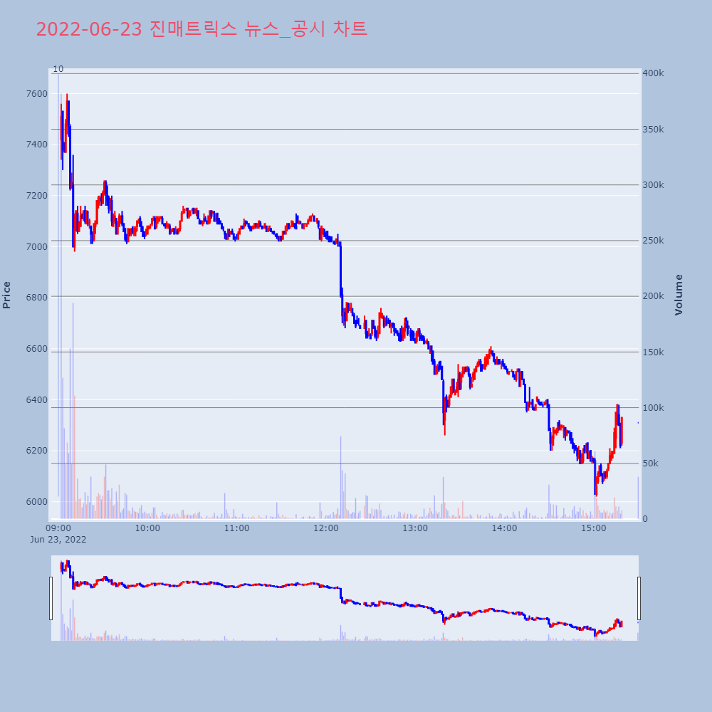 | 10 | 진매트릭스, 0.00% VI 발동진매트릭스(109820)가 VI가 발동했다. 현재 8, | 조선경제 | 진매트릭스 | 2022-06-23 09:00:05 |