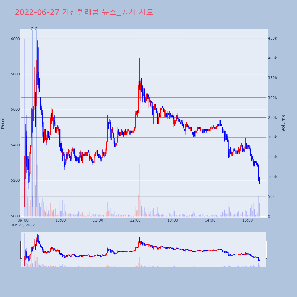 | 2 | [특징주] 기산텔레콤, 상장적격성 실질심사 제외 거래개재 급락[이투데이/조남호 기자(spdran@etoday.co. | 이투데이 | 기산텔레콤 | 2022-06-27 09:15:01 |