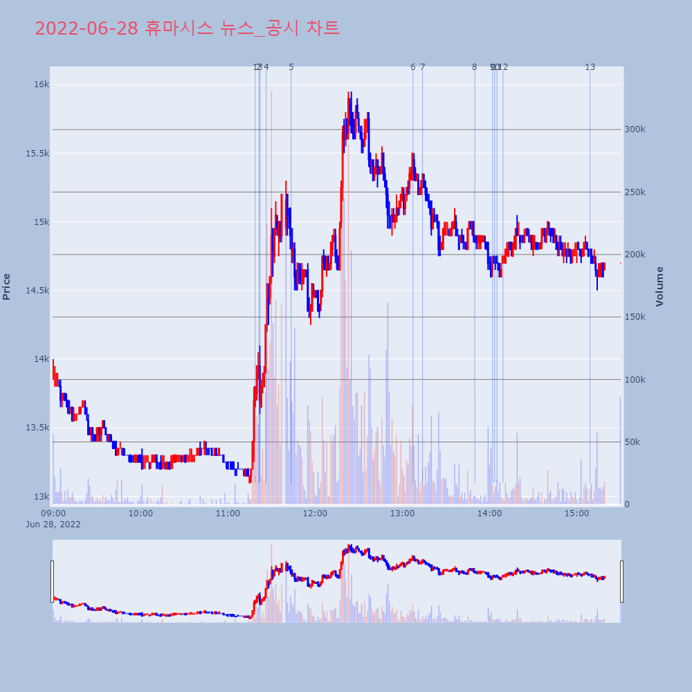 | 6 | [특징주] 휴마시스, 원숭이두창 진단키트 개발 착수 소식에 강세 제목 : [특징주] 휴마시스, 원숭이두창 진단키트 개발 | 인포스탁 | 휴마시스 | 2022-06-28 13:07:22 |