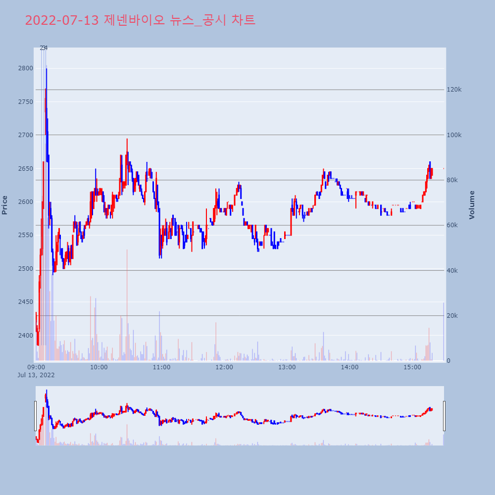 | 3 | 제넨바이오, +12.71% VI 발동제넨바이오(072520)가 VI가 발동했다. 전일 대비 | 조선경제 | 제넨바이오 | 2022-07-13 09:07:25 |