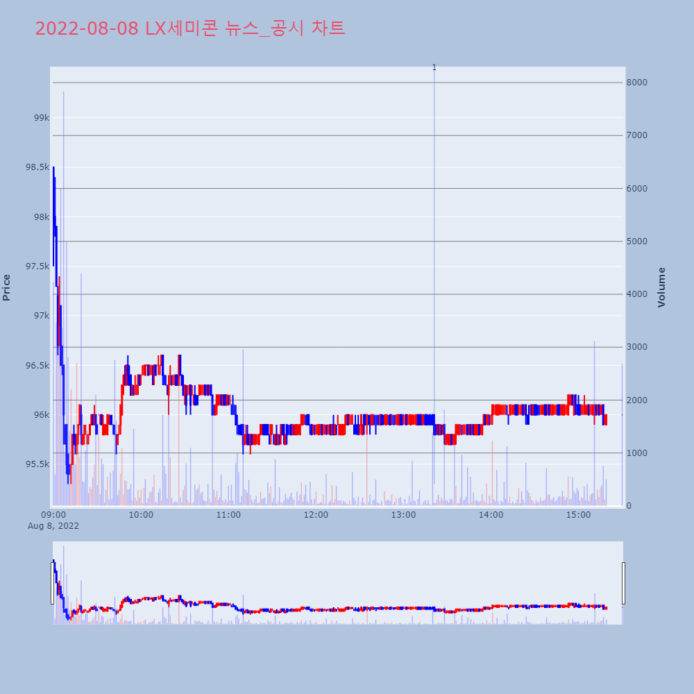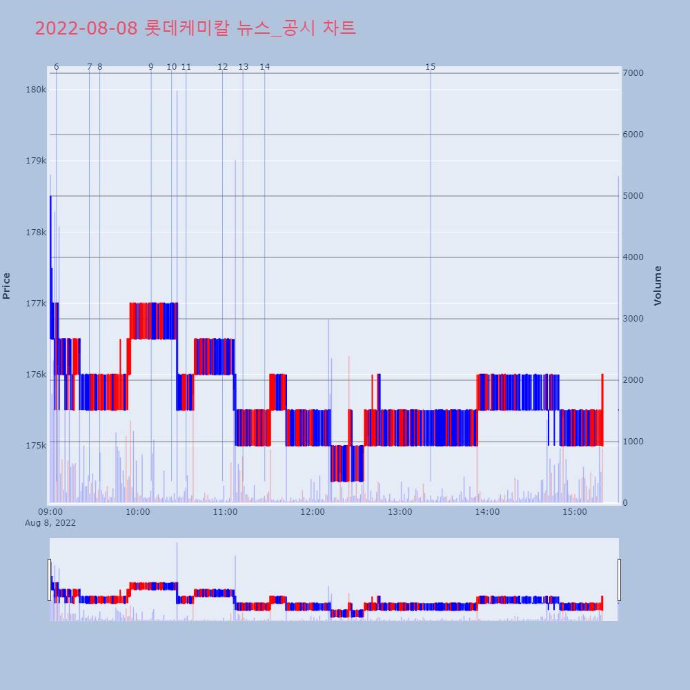 | 6 | 석유화학주 하락 출발, 롯데케미칼 -3.30% 제목 :석유화학주 하락 출발, 롯데케미칼 -3.30% | 인포스탁 | 롯데케미칼 | 2022-08-08 09:04:07 |
