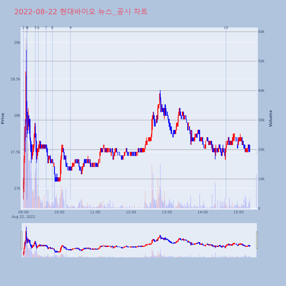 | 7 | [특징주] 현대바이오, 코로나 치료제 제조설비 15대 발주… 4%↑ 제목 : [특징주] 현대바이오, 코로나 치료제 제조설비 | 인포스탁 | 현대바이오 | 2022-08-22 09:38:00 |