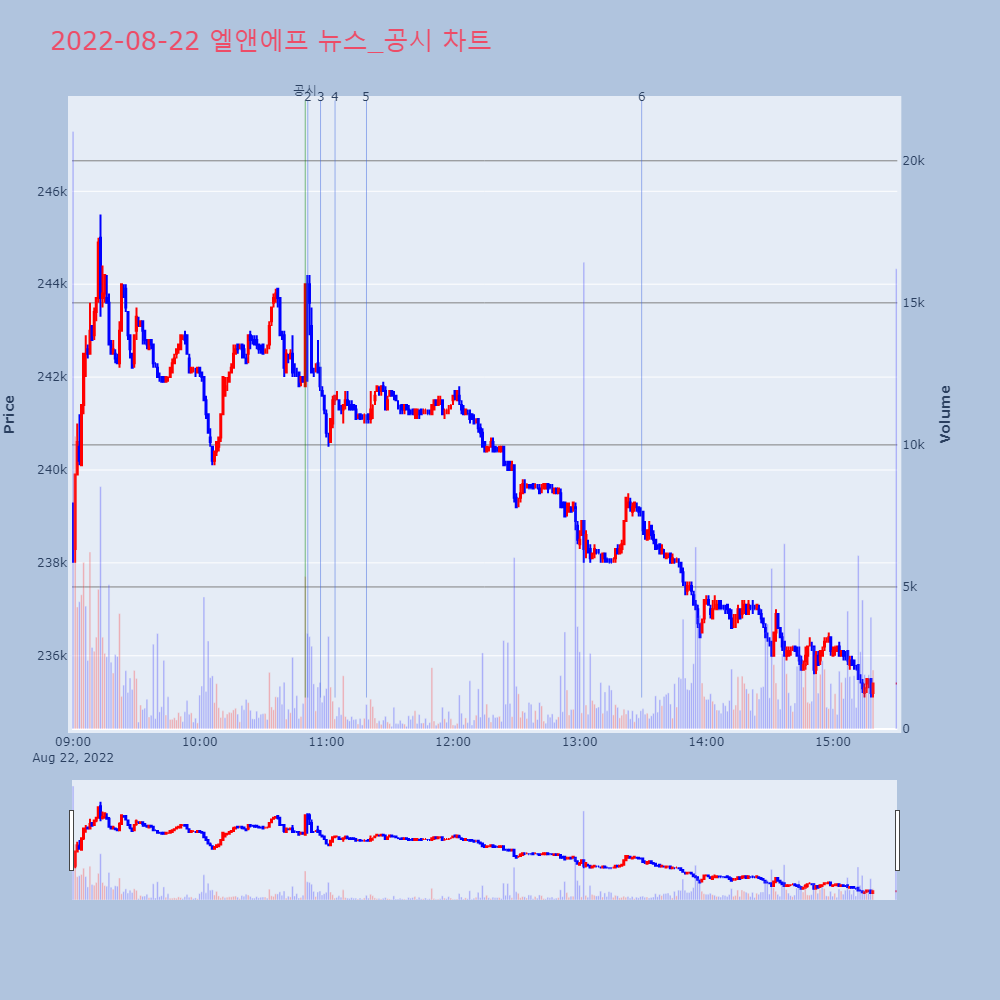 | 2 | 엘앤에프, 6,500.00억원 규모 신규 시설투자 결정 제목 : 엘앤에프, 6,500.00억원 규모 신규 시설 | 인포스탁 | 엘앤에프 | 2022-08-22 10:51:13 |