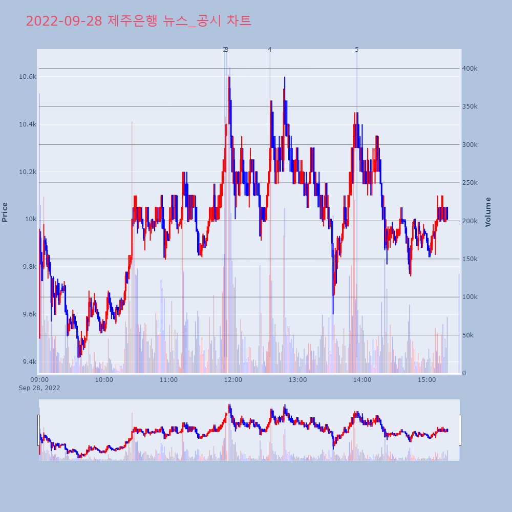 | 3 | 제주은행, +11.59% VI 발동제주은행이 VI가 발동했다. 전일 대비 11.59% 상 | 조선경제 | 제주은행 | 2022-09-28 11:54:10 |
