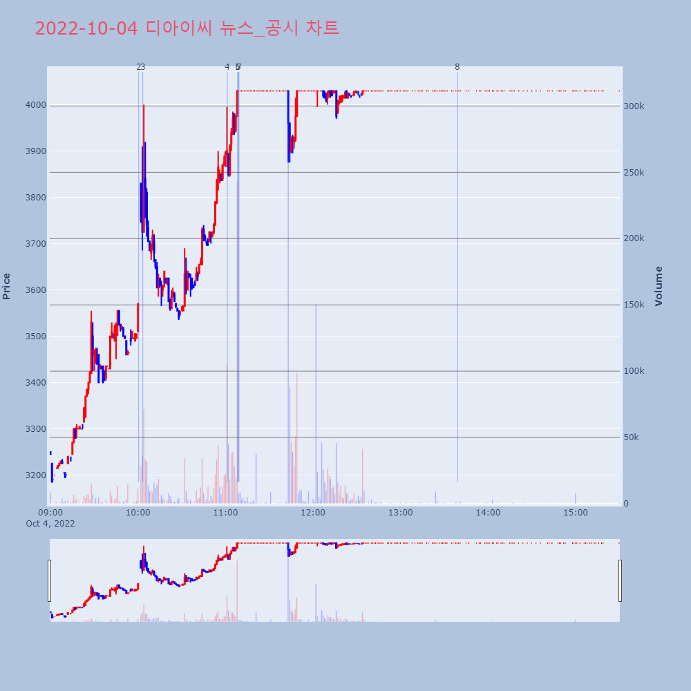 | 5 | 디아이씨, +30.00% 상한가디아이씨가 상한가를 기록했다. 전일 대비 30.00% | 조선경제 | 디아이씨 | 2022-10-04 11:08:15 |