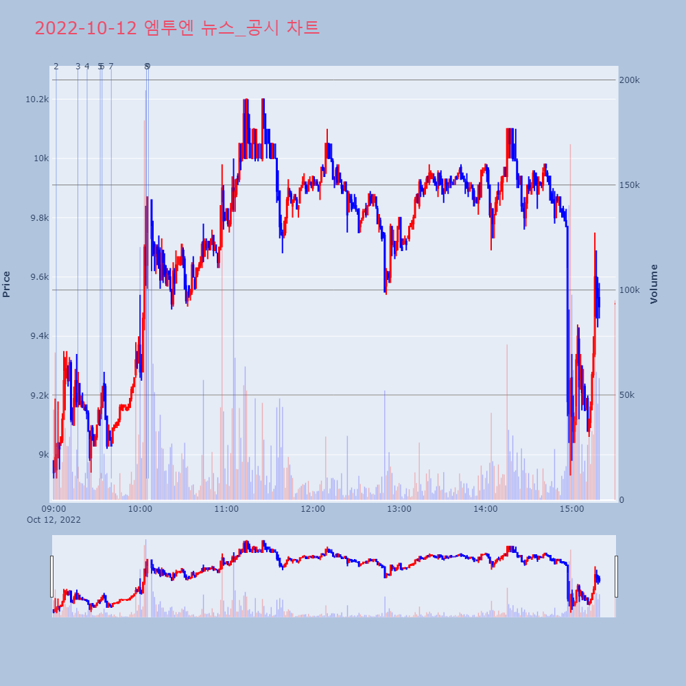 | 9 | 엠투엔, +14.90% VI 발동엠투엔이 VI가 발동했다. 전일 대비 14.90% 상승 | 조선경제 | 엠투엔 | 2022-10-12 10:05:52 |