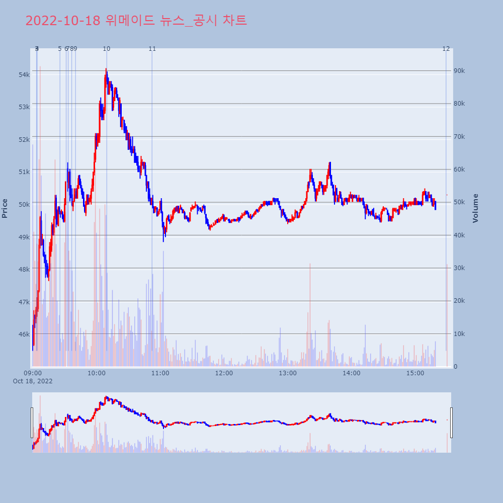 | 12 | [특징주] 위메이드, 나스닥 훈풍에 18%대 급등 제목 : [특징주] 위메이드, 나스닥 훈풍에 18%대 | 인포스탁 | 위메이드 | 2022-10-18 15:29:03 |