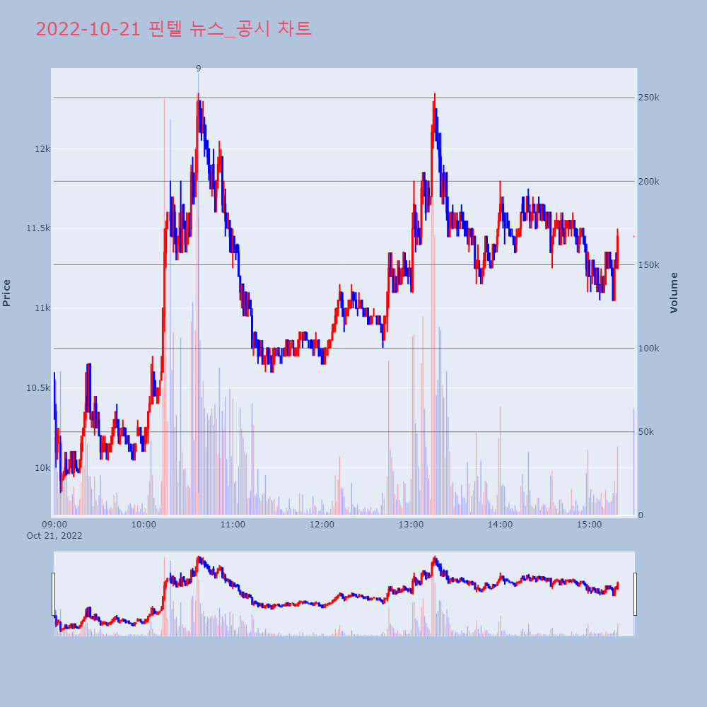 | 4 | [특징주] 핀텔, 코스닥 상장 첫날 하락세… 시초가 1만5300원 제목 : [특징주] 핀텔, 코스닥 상장 첫날 하락세… | 인포스탁 | 핀텔 | 2022-10-20 09:19:59 |