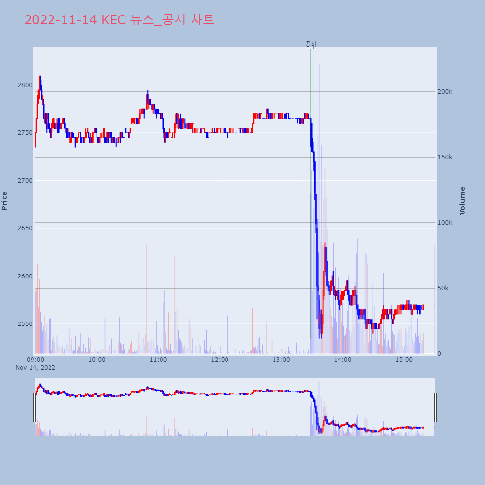| 1 | KEC, 당해사업연도 3분기 연결 영업이익 12.89억원 KEC은 분기보고서를 통해 당해사업연도 3분기 연결기준 | 인포스탁 | KEC | 2022-11-14 13:31:14 |