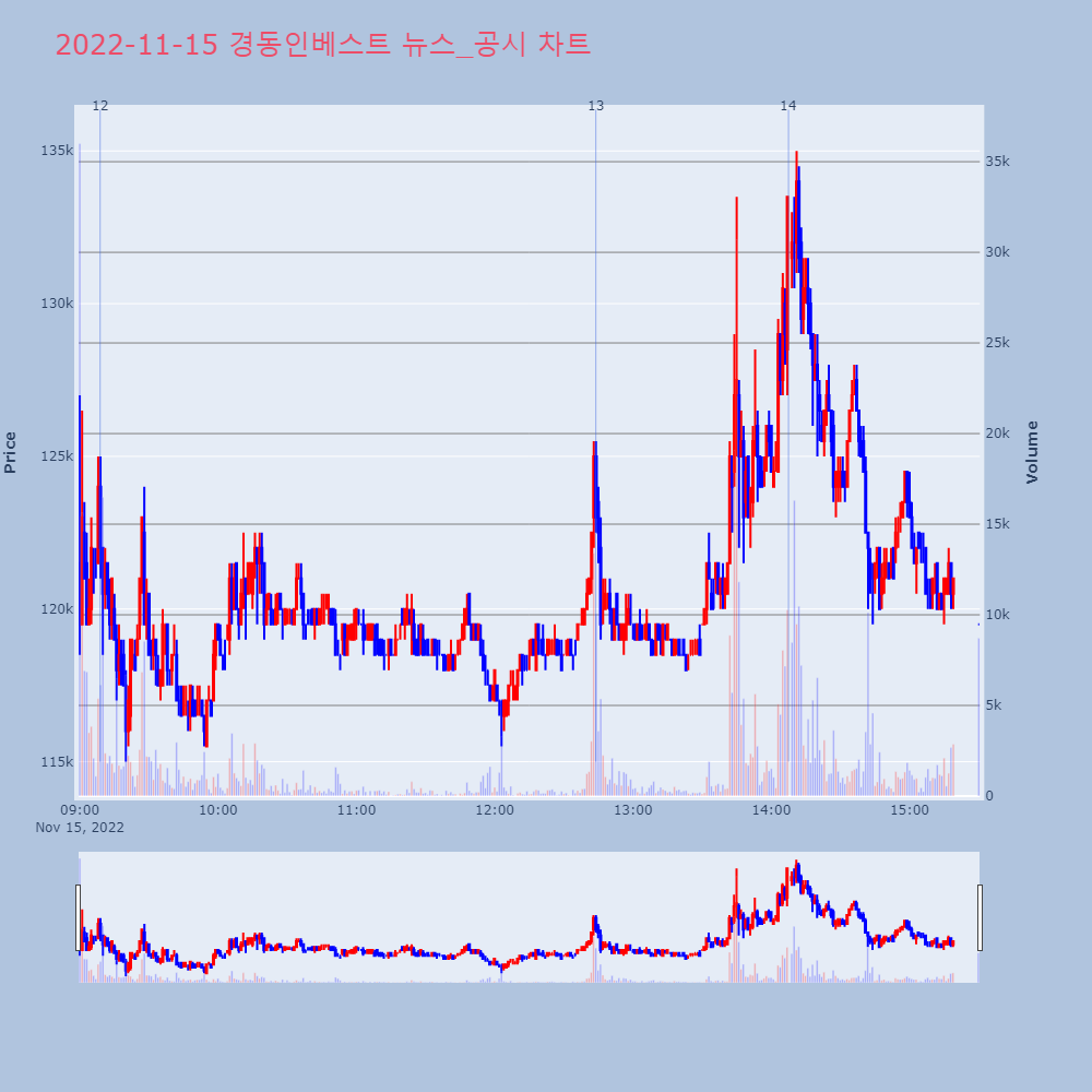 | 14 | 경동인베스트, +11.72% VI 발동경동인베스트가 VI가 발동했다. 전일 대비 11.72% | 조선경제 | 경동인베스트 | 2022-11-15 14:07:29 |