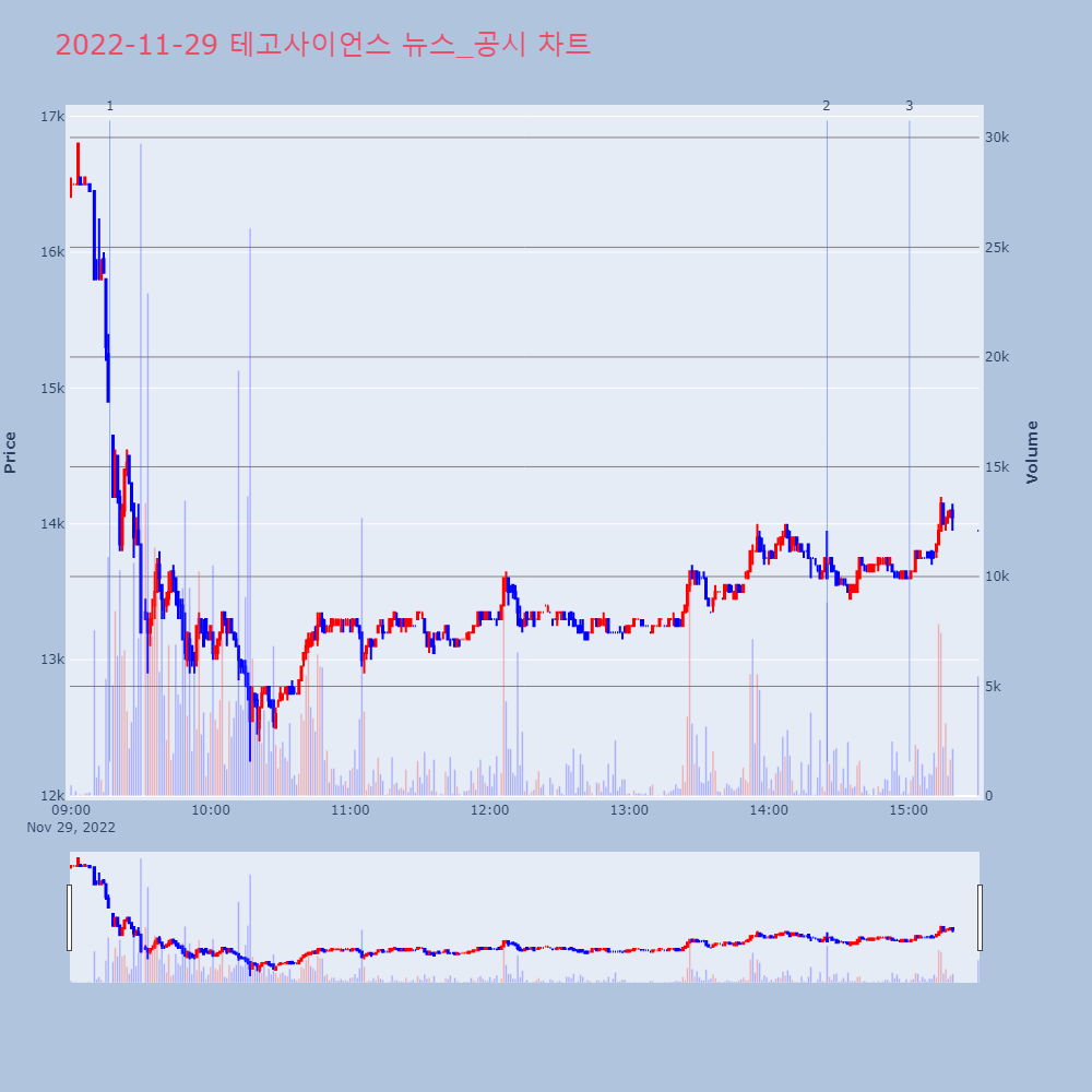 | 1 | 테고사이언스, -11.31% VI 발동테고사이언스가 VI가 발동했다. 전일 대비 11.31% | 조선경제 | 테고사이언스 | 2022-11-29 09:16:40 |