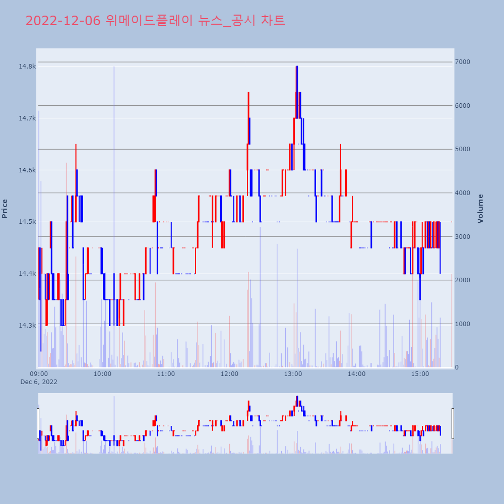 | 15 | [특징주] '위믹스 상장폐지' 위메이드, 급등 뒤 보합권 마감(종합)[특징주] '위믹스 상장폐지' 위메이드, 급등 뒤 보합 | 연합뉴스 | 위메이드 | 2022-12-05 15:38:31 |