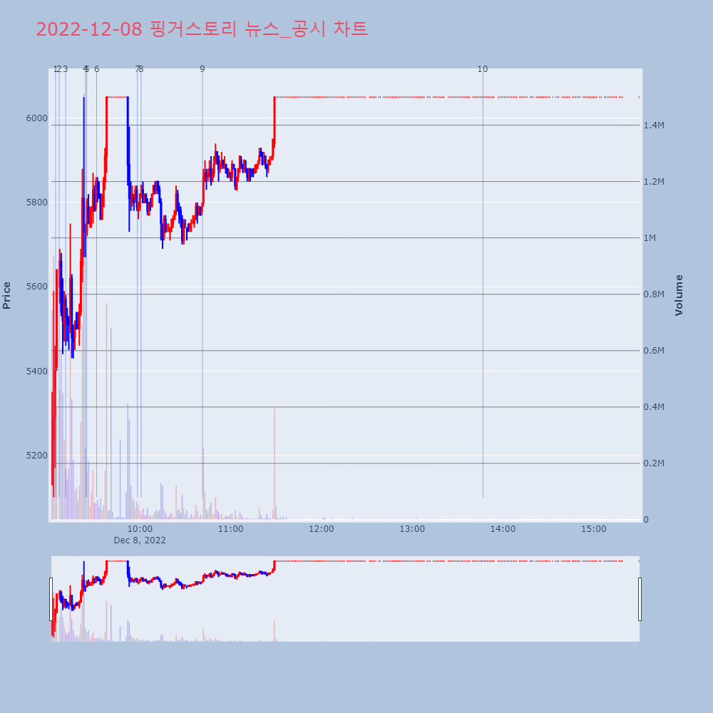 | 7 | [특징주] 핑거스토리, 코스닥 입성 첫날 주가 강세 제목 : [특징주] 핑거스토리, 코스닥 입성 첫날 주가 | 인포스탁 | 핑거스토리 | 2022-12-08 09:58:22 |