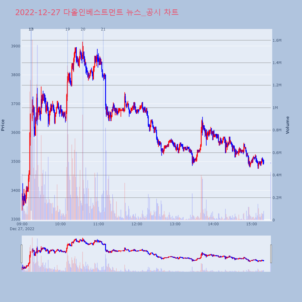 | 2 | 다올인베스트먼트(298870) 급등 출발 +10.25% 기업개요 다올투자증권 계열의 중소기업 창업투자회사. | 인포스탁 | 다올인베스트먼트 | 2022-12-26 09:05:11 |