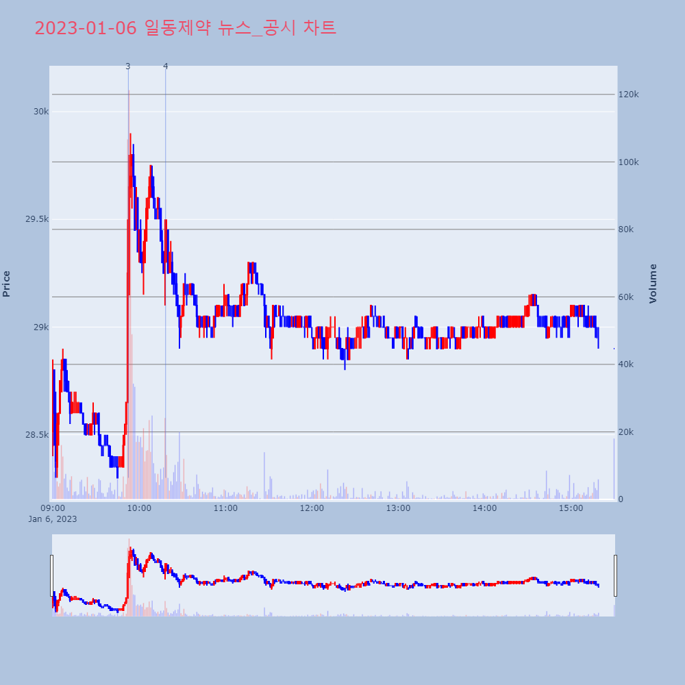 | 4 | [특징주] 일동제약, 시오노기 中 조코바 승인 신청 소식에 강세 제목 : [특징주] 일동제약, 시오노기 中 조코바 승인 | 인포스탁 | 일동제약 | 2023-01-06 10:18:23 |