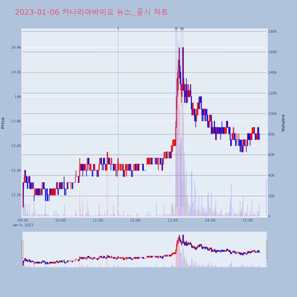 | 8 | [강세 토픽] 배합사료·첨가제 테마, 카나리아바이오 +6.39%, 미래생명자원[배합사료·첨가제] 테마가 강세다. 전일 대비 2.62 | 조선경제 | 카나리아바이오 | 2023-01-06 13:13:26 |