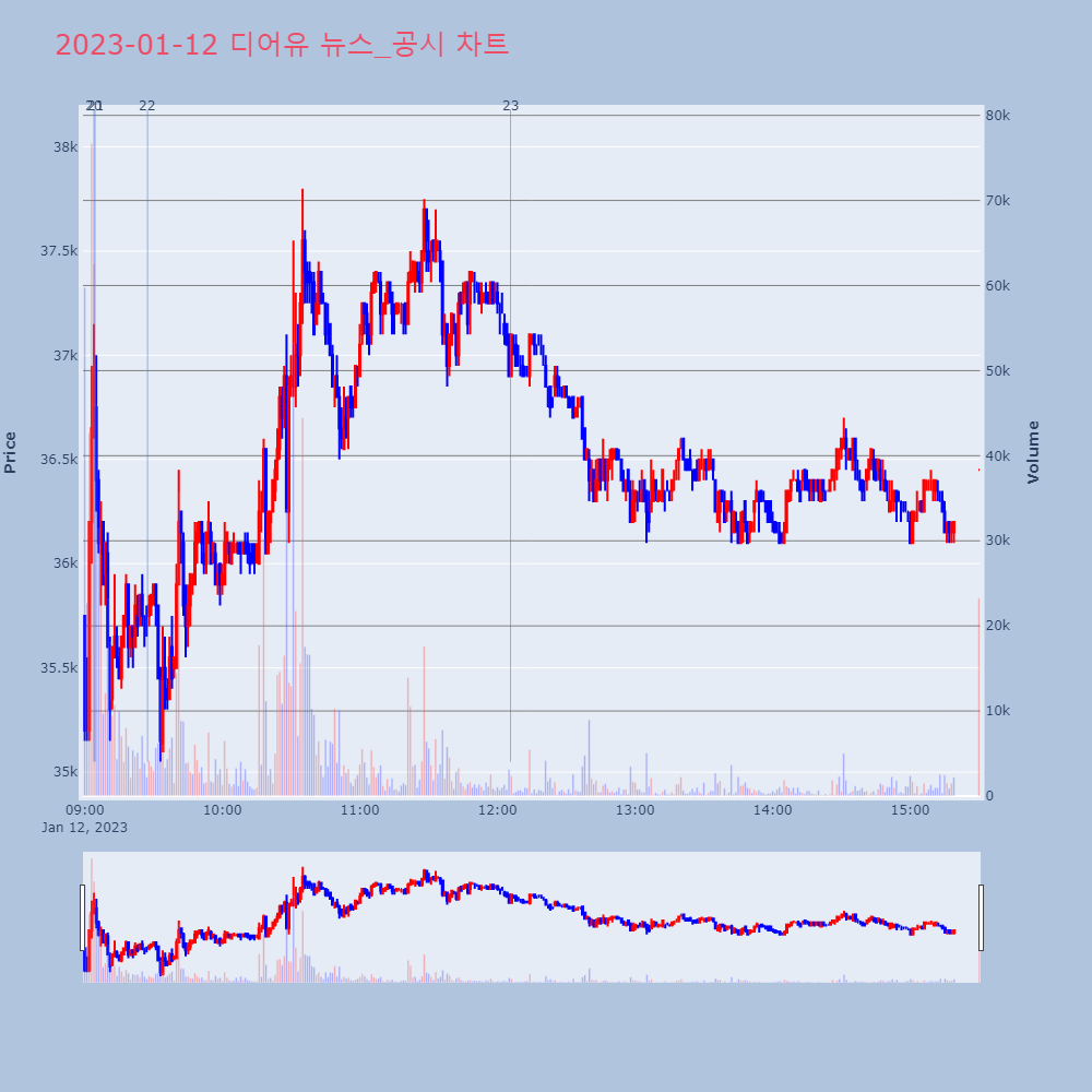 | 23 | [특징주] 디어유, 6%대 강세...'유니버스' 인수에 2거래일 연속 상승 제목 : [특징주] 디어유, 6%대 강세...'유니버스 | 인포스탁 | 디어유 | 2023-01-12 12:05:41 |