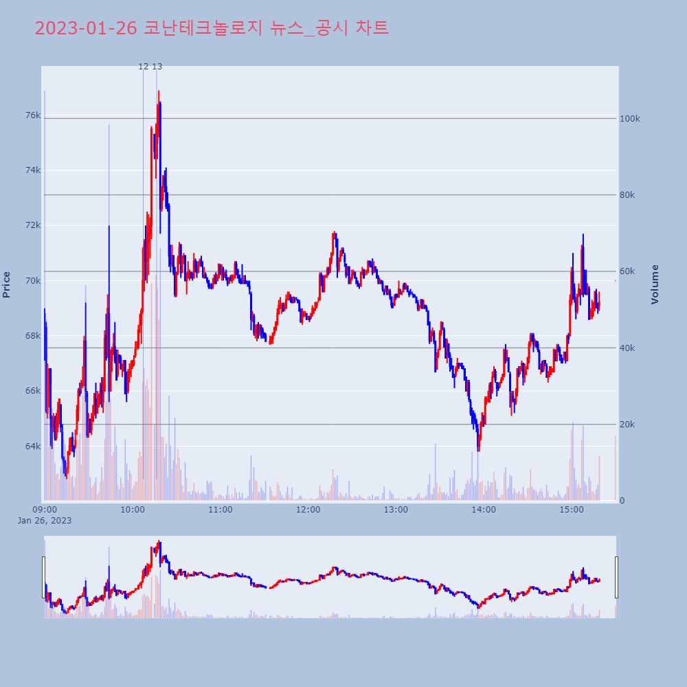 | 3 | 코난테크놀로지, +14.65% VI 발동코난테크놀로지가 VI가 발동했다. 전일 대비 14.65 | 조선경제 | 코난테크놀로지 | 2023-01-25 09:03:14 |