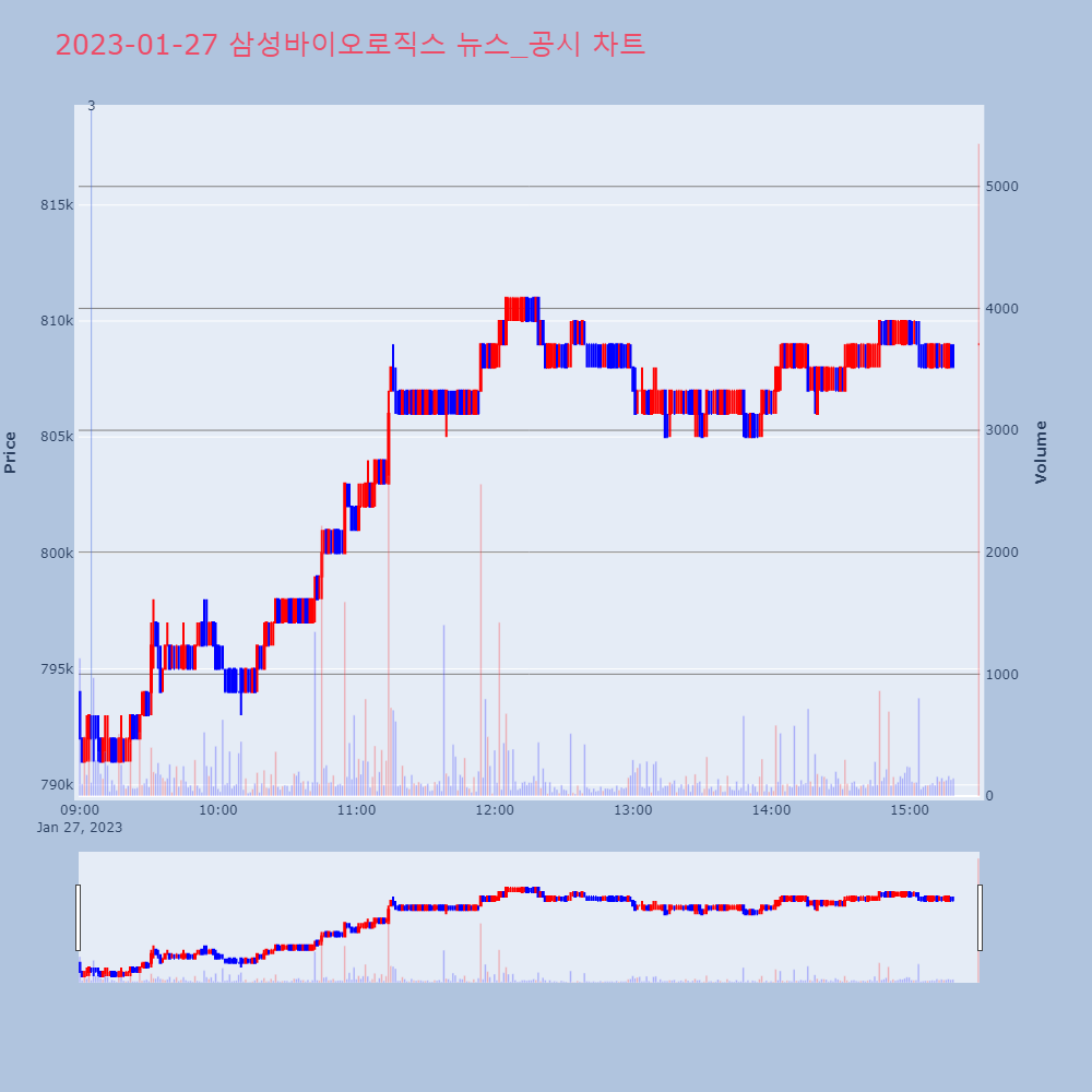 | 3 | [업종 대표주] 제약: 삼성바이오로직스 -0.25% 출발제약 업종 대표주인 삼성바이오로직스가 0.25% 하락한 | 조선경제 | 삼성바이오로직스 | 2023-01-27 09:05:02 |
