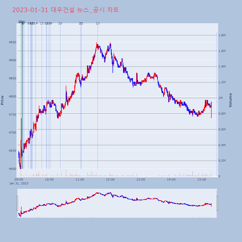 | 17 | 대우건설(047040) 소폭 상승세 +3.01% 기업개요 시공능력 상위의 대형종합건설업체. 토목 및 | 인포스탁 | 대우건설 | 2023-01-31 09:55:13 |