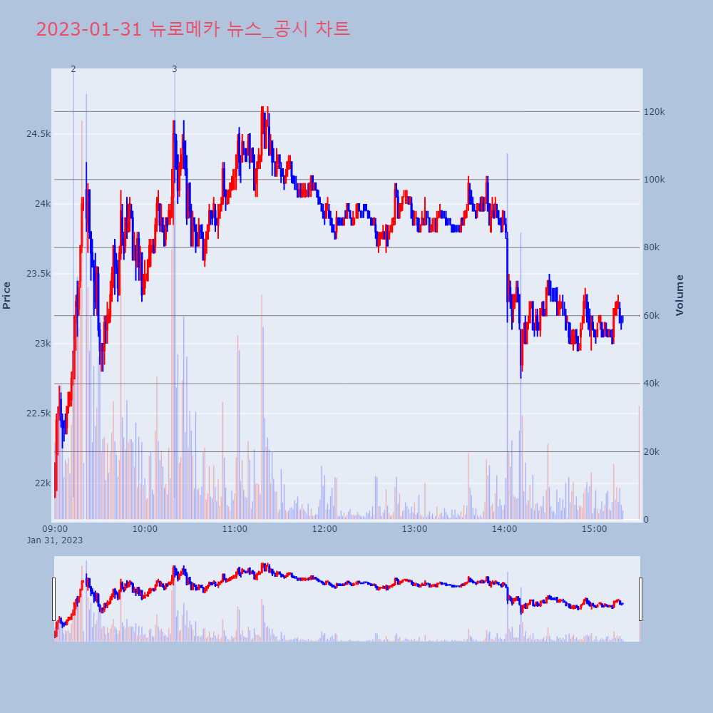 | 3 | [장중수급포착] 뉴로메카, 외국인 69,233주 대량 순매수... 주가 +8.39% [서울=뉴스핌] 로보뉴스 = 31일 10시 15분 현재 | 뉴스핌 | 뉴로메카 | 2023-01-31 10:20:00 |