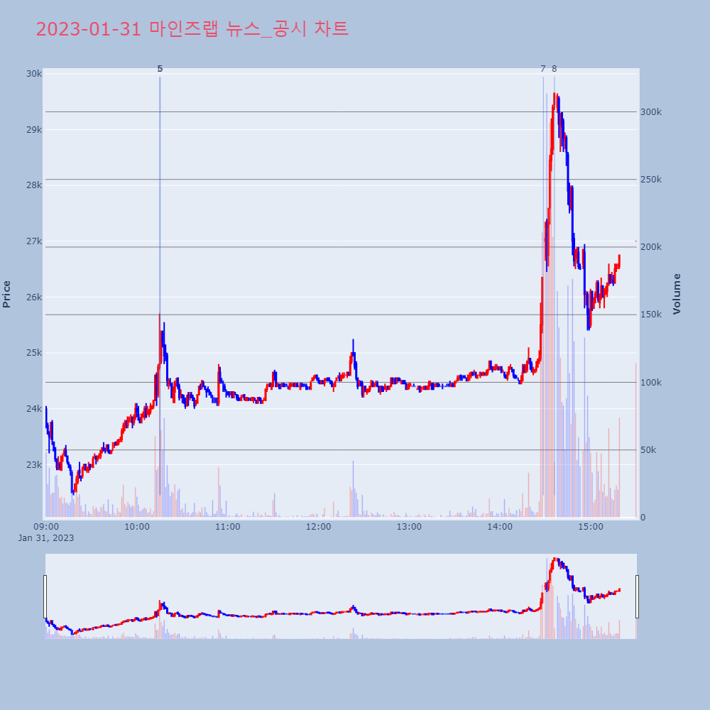 | 7 | 마인즈랩, +8.21% VI 발동마인즈랩이 VI가 발동했다. 전일 대비 8.21% 상승 | 조선경제 | 마인즈랩 | 2023-01-31 14:28:45 |
