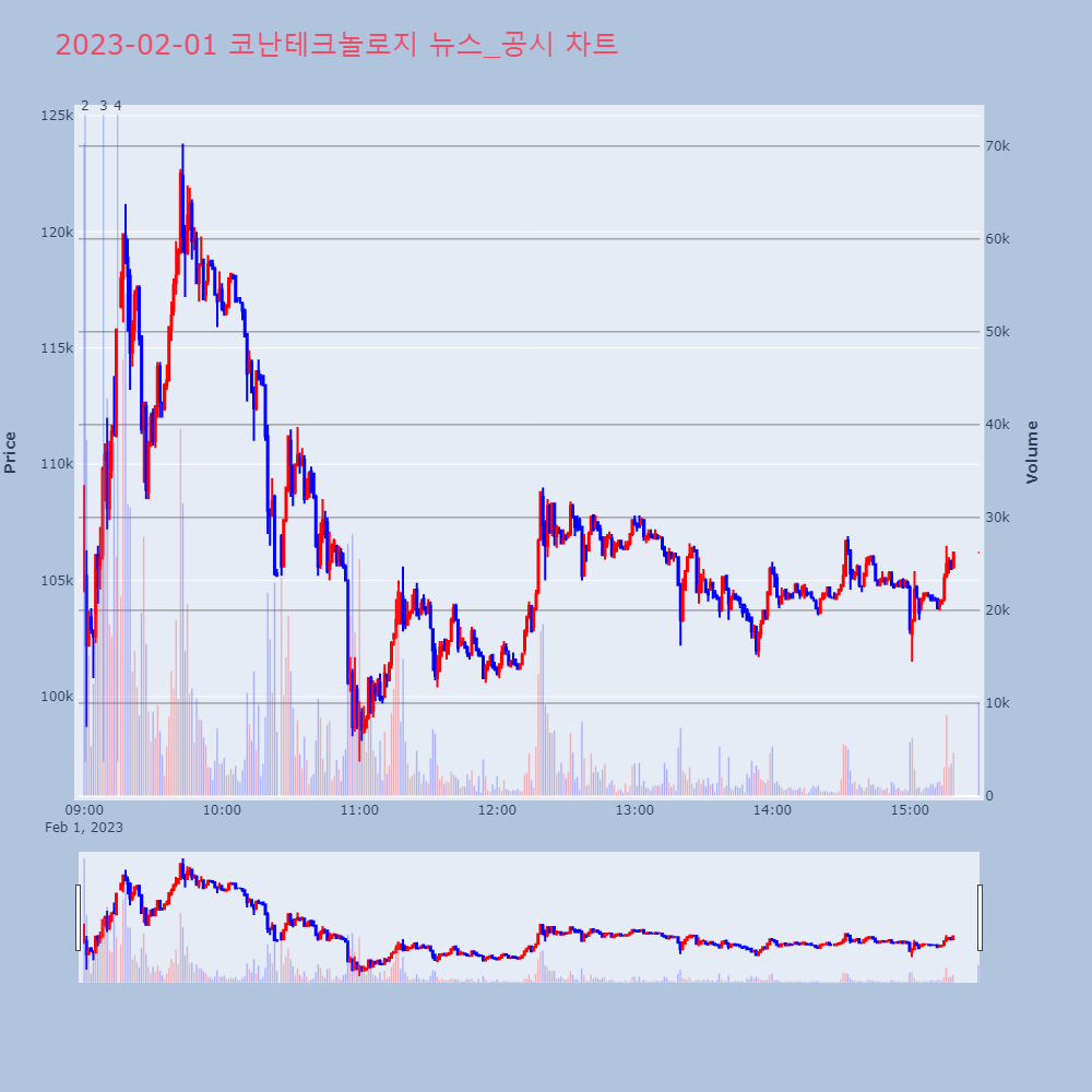 | 4 | 코난테크놀로지, +10.46% VI 발동코난테크놀로지가 VI가 발동했다. 전일 대비 10.46 | 조선경제 | 코난테크놀로지 | 2023-02-01 09:14:36 |