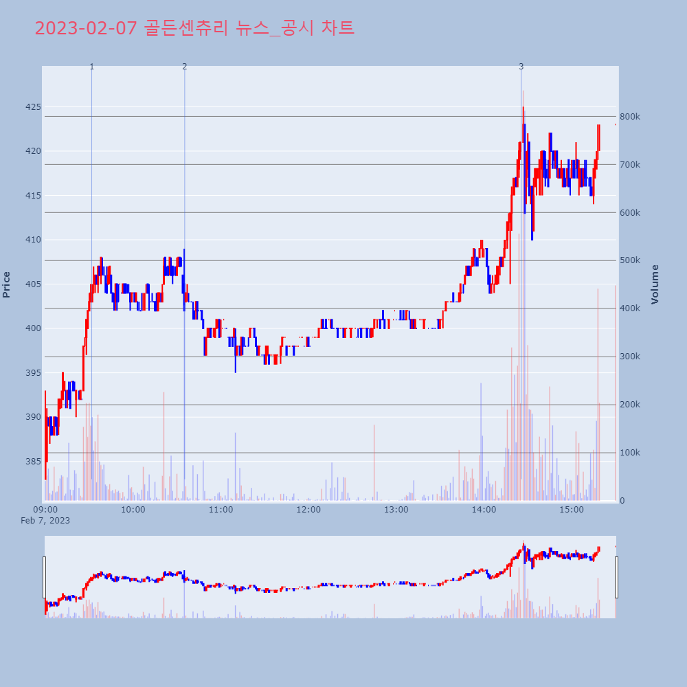 | 3 | 골든센츄리, +9.64% VI 발동골든센츄리가 VI가 발동했다. 전일 대비 9.64% 상 | 조선경제 | 골든센츄리 | 2023-02-07 14:25:36 |