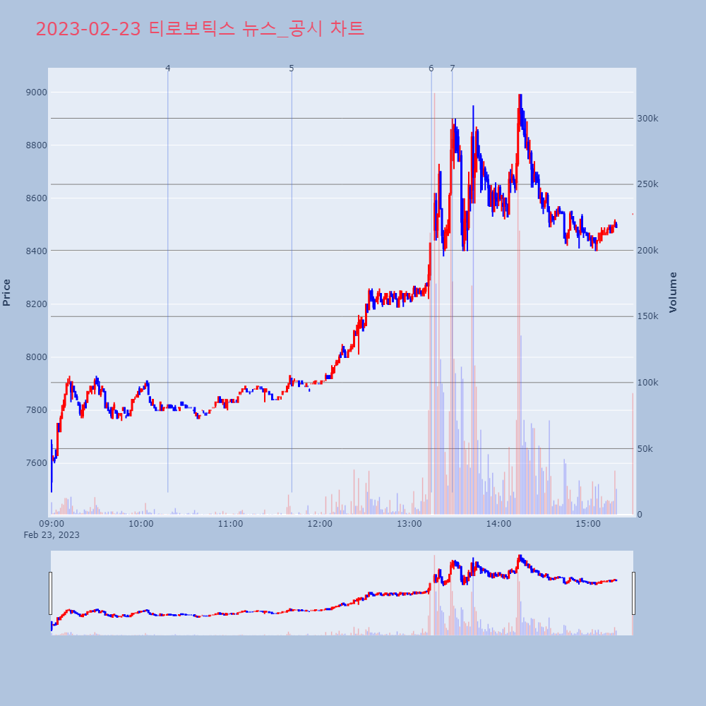 | 6 | 티로보틱스, +10.34% VI 발동티로보틱스가 VI가 발동했다. 전일 대비 10.34% | 조선경제 | 티로보틱스 | 2023-02-23 13:14:56 |