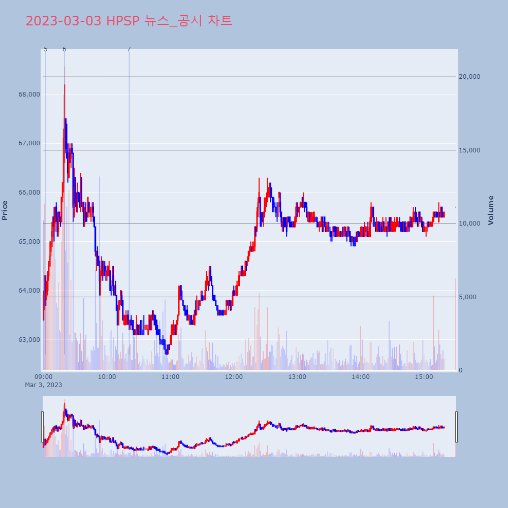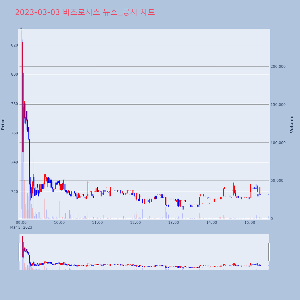 | 5 | 비츠로시스, 0.00% VI 발동비츠로시스가 VI가 발동했다. 현재 683원에 거래되고 | 조선경제 | 비츠로시스 | 2023-03-03 09:00:10 |