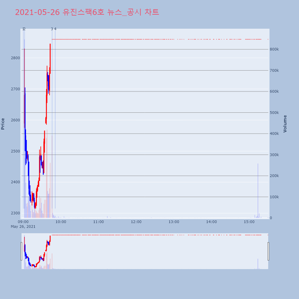 | 4 | 1 | 유진스팩6호, 0.00% VI 발동유진스팩6호(373340)가 VI가 발동했다. 현재 2 | 조선경제 | 유진스팩6호 | 2021-05-26 09:00:13 |