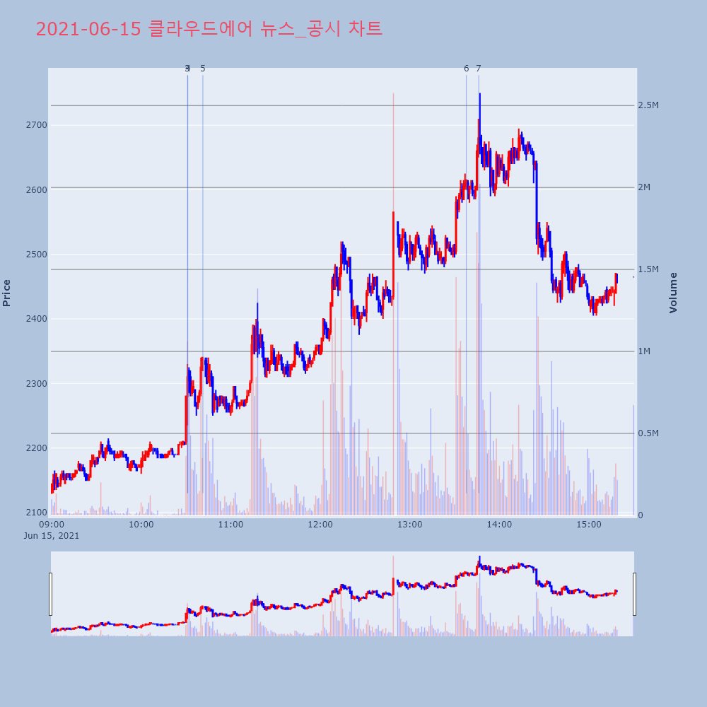 3 | 5 | 클라우드에어, +8.58% VI 발동클라우드에어(036170)가 VI가 발동했다. 전일 대 | 조선경제 | 클라우드에어 | 2021-06-15 10:41:20 |