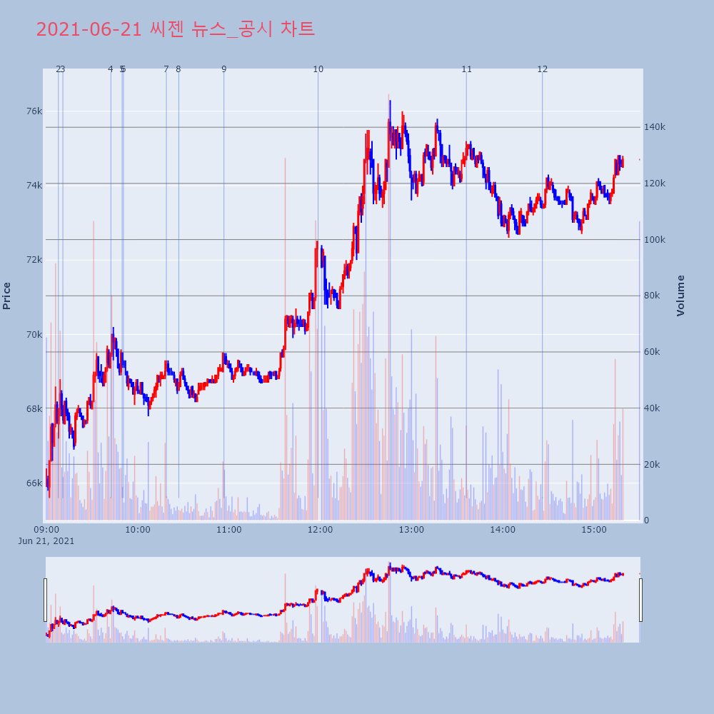 | 4 | 10 | 씨젠, +12.93% VI 발동씨젠(096530)이 VI가 발동했다. 전일 대비 12 | 조선경제 | 씨젠 | 2021-06-21 11:58:39 |