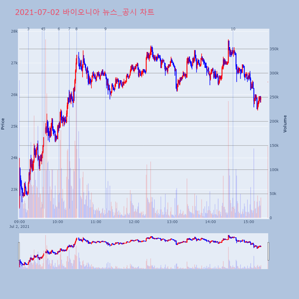 | 6 | 5 | 바이오니아, +13.59% VI 발동바이오니아(064550)가 VI가 발동했다. 전일 대비 | 조선경제 | 바이오니아 | 2021-07-02 09:38:48 |