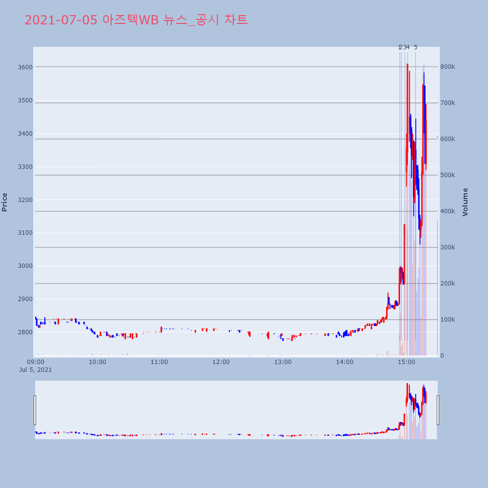 | 4 | 3 | 아즈텍WB, +10.04% VI 발동아즈텍WB(032080)가 VI가 발동했다. 전일 대비 | 조선경제 | 아즈텍WB | 2021-07-05 14:58:31 |