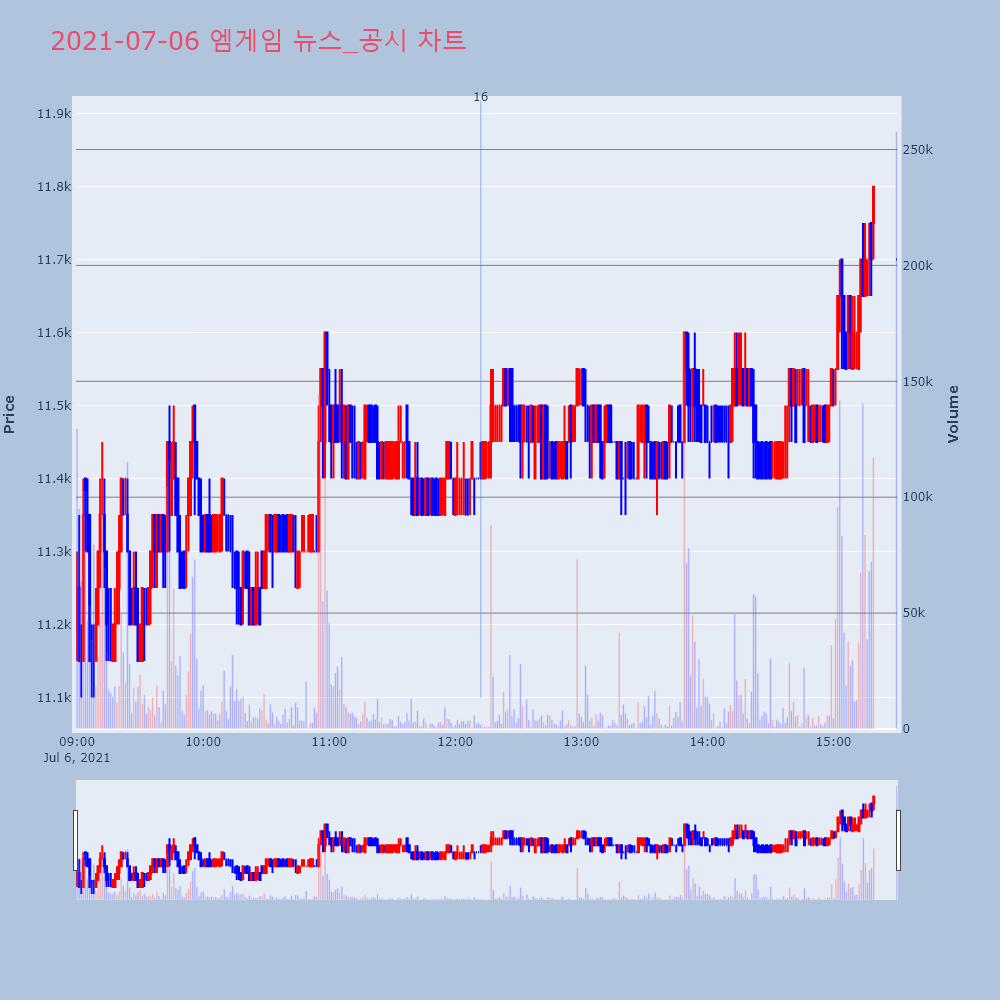 | 1 | 15 | [업앤다운]게임주 상승…엠게임 52주최고가·조이시티↓ 제목 : [업앤다운]게임주 상승…엠게임 52주최고가·조 | 인포스탁 | 엠게임 | 2021-07-05 16:27:28 |