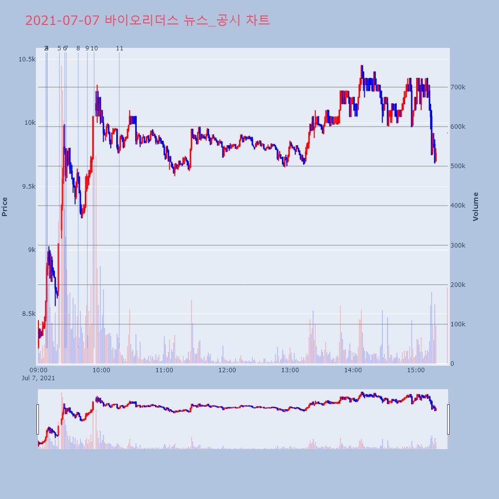 | 7 | 5 | 바이오리더스, +11.18% VI 발동바이오리더스(142760)가 VI가 발동했다. 전일 대 | 조선경제 | 바이오리더스 | 2021-07-07 09:20:02 |