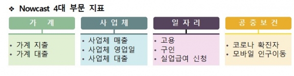 Nowcast 포털은 공공·민간 빅데이터를 이용하여 가계, 사업체, 일자리, 공중보건 4대 부문의 10개 속보성 지표를 개발하여 주간 단위로 시의성 있게 정보를 제공하는 것을 목표로 하고 있다.