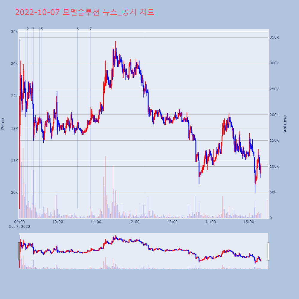 | 7 | [특징주]모델솔루션, 코스닥 상장 첫날 9%대 강세[아시아경제 이정윤 기자] 모델솔루션이 상장 첫날 강세 | 아시아경제 | 모델솔루션 | 2022-10-07 10:51:50 |