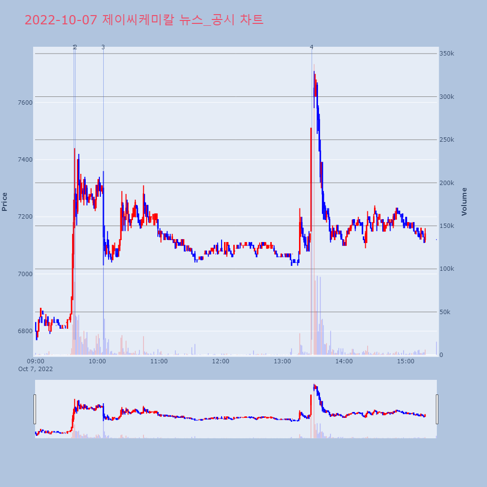 | 4 | 제이씨케미칼, +9.36% VI 발동제이씨케미칼이 VI가 발동했다. 전일 대비 9.36% | 조선경제 | 제이씨케미칼 | 2022-10-07 13:28:43 |