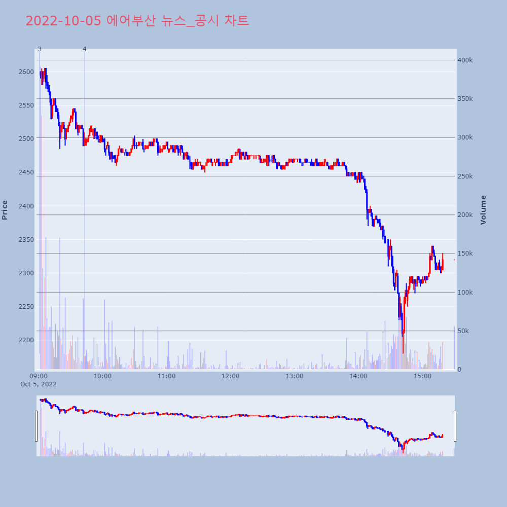 | 3 | 에어부산, 0.00% VI 발동에어부산이 VI가 발동했다. 현재 3,065원에 거래되 | 조선경제 | 에어부산 | 2022-10-05 09:01:01 |