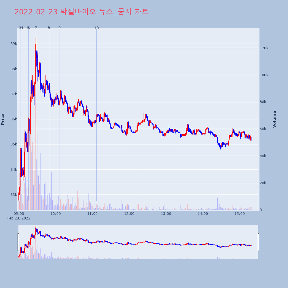 | 6 | 박셀바이오, +13.01% VI 발동박셀바이오(323990)가 VI가 발동했다. 전일 대비 | 조선경제 | 박셀바이오 | 2022-02-23 09:16:05 |